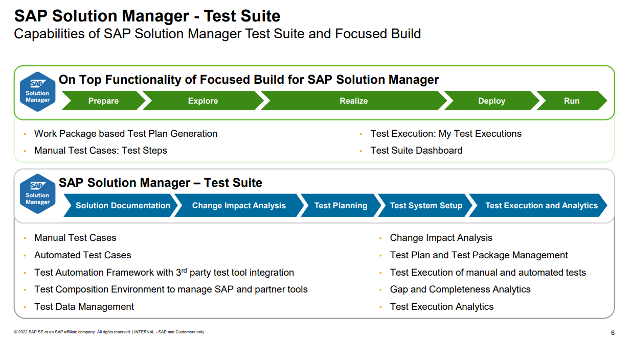 Die Test-Suite des SAP Solution Managers (https://help.sap.com/docs/SUPPORT_CONTENT/sm/3530264795.html) besteht im Wesentlichen aus dem Testplan-Management zur Vorbereitung der Tests und einer Tester-App, mit der die Anwender die vorbereiteten und freigegebenen Testfälle durchführen. Dazu stehen für den Testmanager verschiedene Funktionen zur Auswertung und Analyse zur Verfügung.